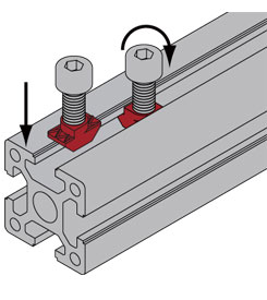 T型螺母是常用的工業(yè)鋁型材緊固連接配件之一,它的優(yōu)點在于使用便捷,不需要預(yù)先置入型材槽內(nèi),可以直接將T型螺母放入固定點然后旋轉(zhuǎn)即可將T型螺母固定于型材槽內(nèi),而后利用相應(yīng)規(guī)格的緊固螺栓即可實現(xiàn)鋁型材框架快速連接組裝; |